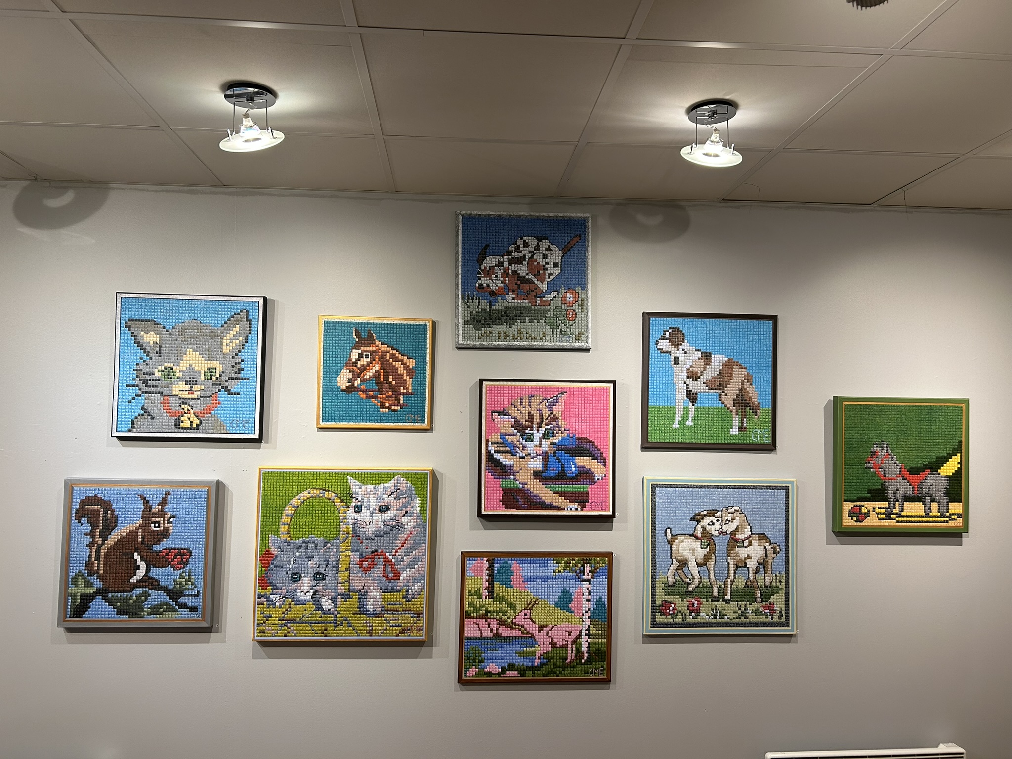 De färdiga broderierna har ramats in och hängts på väggen, till glädje i många hem.